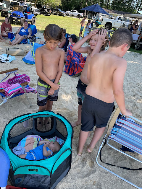 We found a little mesh kennel intended for a pet during our neighborhood yard sale. It is perfect for Riser at the beach! The beach can get pretty crowded with kids running all over during the weekends. It's the perfect safe spot to set him where he won't get unintentionally trampled or have sand kicked on him.